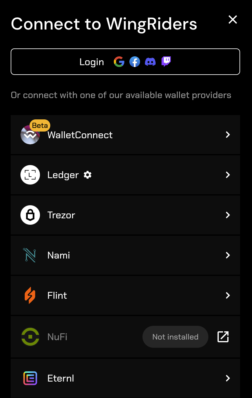 Integrates your DApp with the NuFi web wallet injected into it is as a widget. Users can seamlessly onboard/log in into your DApp using social providers such as Google, Facebook or Discord while being able to manage their wallet in the NuFi interface.